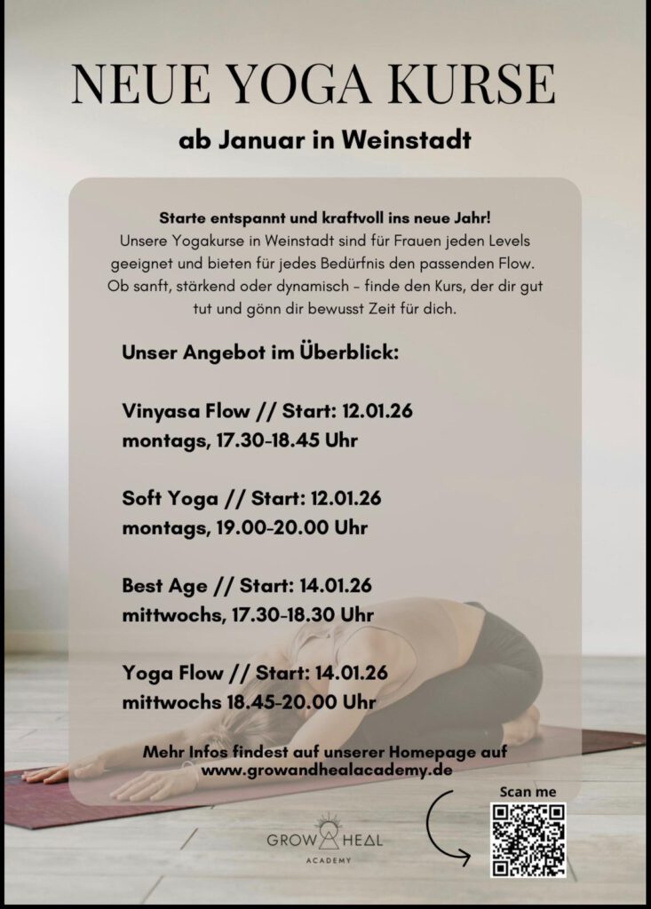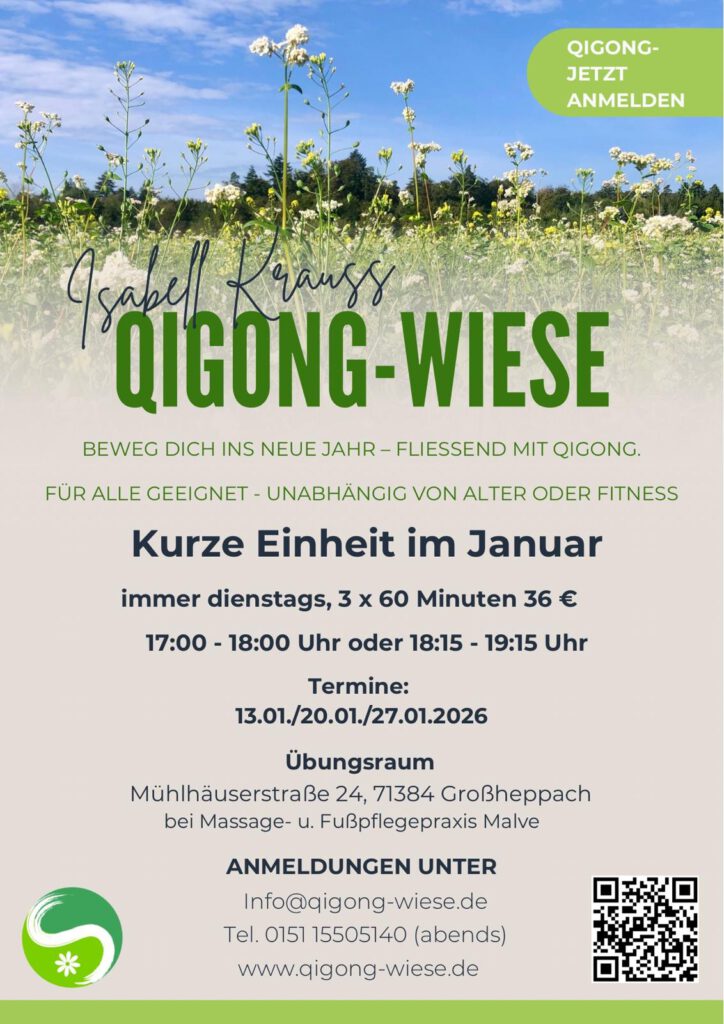 Ergänzend zu den Behandlungen laden wir Sie herzlich zu unseren fachlich angeleiteten Yoga- und Qi-Gong-Kursen ein, um Stress abzubauen, neue Energie zu tanken und Ihre innere Ruhe zu finden.