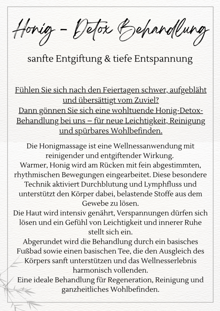 Eine tief reinigende Entgiftungsbehandlung mit Honiggriffen, basischem Fußbad und Detox-Tee. Unterstützt den Stoffwechsel, entlastet das Gewebe und sorgt für spürbare Leichtigkeit.
