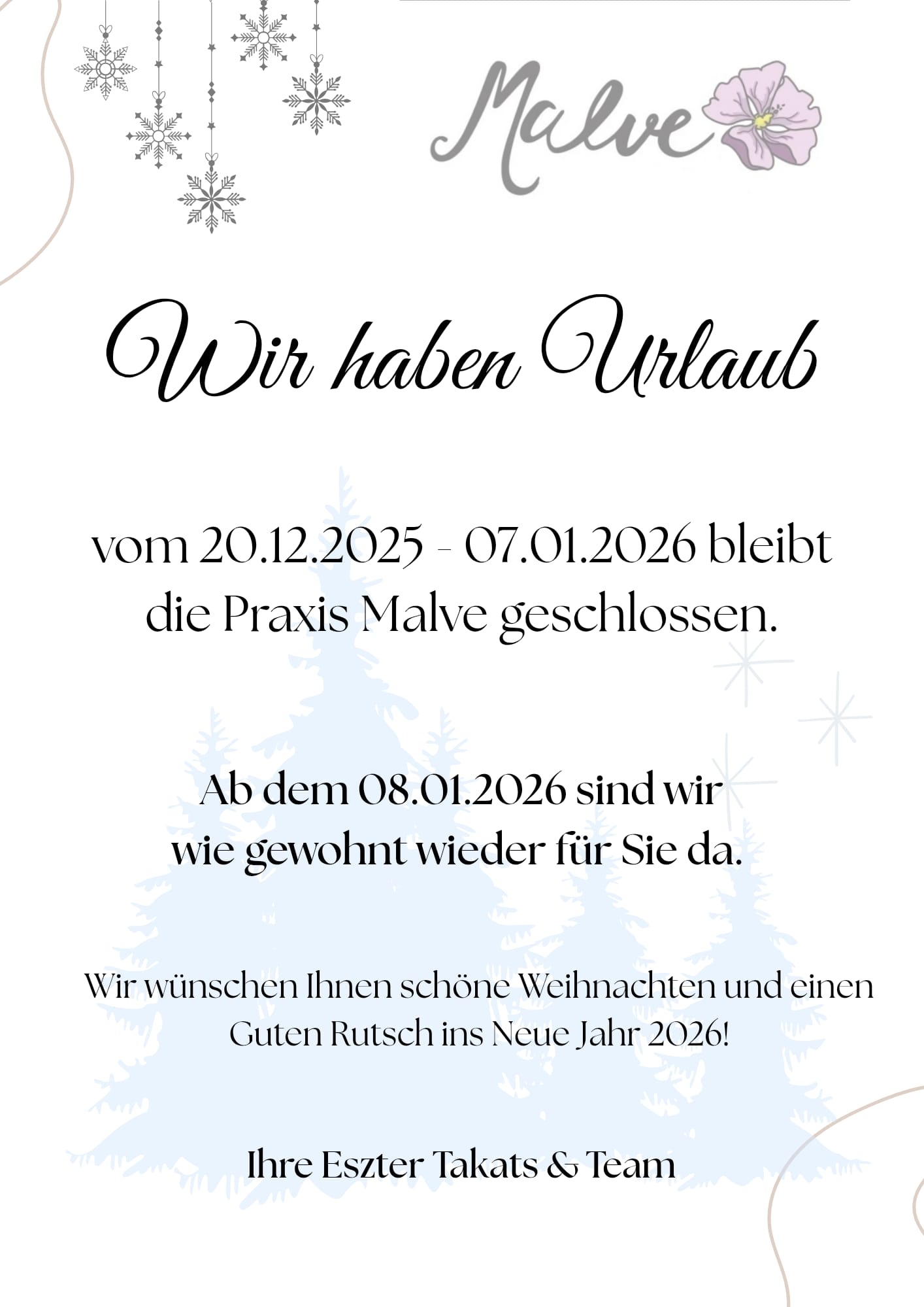 vom 20.12.2025-07.01.2026 bleibt die Praxis Malve geschlossen.